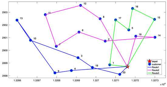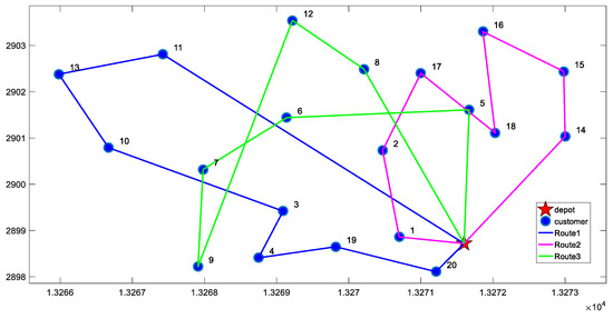 Equation (16) indicates that the goal of the model is to minimize the cost of unit satisfied customer. Equation (17) ensures that the vehicles used cannot exceed the number owned by the distribution center. Equation (18) imposes that all trucks must return to the depot when their distribution tasks are completed. Equations (19) and (20) represent that each customer is only visited once by one truck. Equation (21) shows that the total load on each route cannot exceed the rated load of the vehicle. Equation (22) indicates the time when the vehicle arrives at a customer point.