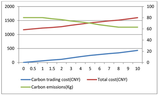 - From Figure 4, under the insufficient quota condition, we can see that when carbon price, carbon emissions remain unchanged; when the carbon price there are continuous reductions in carbon emissions; when carbon pricecarbon emissions basically remain unchanged. Similarly, from the Figure 6, under the sufficient quota condition, there are also three stages in the trend of carbon emissions. Therefore, whether the the carbon quota is sufficient or not, there will be an effective carbon price interval that reduces carbon emissions. As the result shows, cold chain logistics enterprises can reduce the total cost of distribution by optimizing the paths when the carbon price gradually increases in the effective interval. Objectively, there are also better environmental benefits.