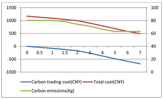 - When the carbon quota is insufficient, that is, the carbon emissions of a company are greater than the carbon quota, the total costs gradually increase with the increase in carbon price. When the carbon quota is sufficient, that is, the carbon emissions of a company are less than the carbon quota, the total costs gradually reduce with the increase in carbon price. Equation (15) shows that carbon trading costs are closely correlated with the difference between carbon emissions and carbon quota. If the carbon quota is insufficient, the difference is positive, resulting in carbon trading expenditures, and the total costs will gradually increase. On the contrary, the other scenario will generate carbon trading revenue, and the total costs will gradually decrease.