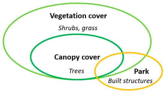 In this study, the amount of UGS were measured using three different metrics: vegetation cover, canopy cover, and park area. These metrics capture different aspects of UGS. As shown in Figure 1, canopy cover is a subset of vegetation cover, parks overlap with both vegetation cover and canopy cover. The island-wide vegetation cover and canopy cover was obtained from an earlier study []. These spatial data were derived from WorldView-2 satellite images with 2-m resolution for Singapore acquired in 2015. The polygons of park area, including both parks and nature reserves, were obtained from the Singapore Land Authority (SLA).