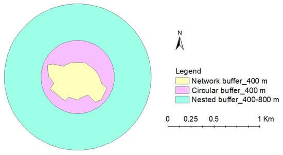 The selection of scale of analysis was based on the results from the Park Usage and Satisfaction Survey conducted by National Parks Board (NParks) (the national government agency responsible for green space planning and management in Singapore) in 2009. This national-level survey reported that five minutes is the maximum travel time that frequent users are willing to spend to visit a neighborhood park []. The Euclidean distance for five-minute walking is generally accepted as 400 m. As suggested by a recent review on the scale issue [], nested buffers are useful for examining the scale effects. Therefore, 400 m, 400–800 m, 800–1200 m, 1200–1600 m, 1600–2000 m, 2000–2400 m, 2400–2800 m were used as nested buffers to represent the space range with walking distance of 5 mins, 5–10 mins, 10–15 mins, 15–20 mins, 20–25 mins, 25–30 mins, and 30–35 mins, respectively. In contrast to a recent literature which calculated the weighted UGS exposure by assigning different weight for each nested buffer [], the purpose of introducing nested buffers in this study is to distinguish the association of nearby greenery and distant greenery with mental health. To obtain a better understanding of the scale dependence of UGS-health relationships, a range of circular buffers with the radius of 50 m, 100 m, 200 m, 300 m, 400 m, 500 m, 600 m, 700 m, 800 m, 1000 m, 1200 m, 1600 m, 2000 m, 2400 m, and 2800 m were applied to measure UGS quantity. It is still uncertain whether visual contact with UGS is enough to bring mental health benefits or if direct use of UGS is needed for detectable health benefits. Direct use of UGS would still be a possible mechanism underlying the relationship between UGS quantity and mental health. As it has been suggested that network buffers based on road networks can better examine the usable greenness [], in this study, eight network buffers with the distance of 400 m, 800 m, 1000 m, 1200 m, 1600 m, 2000 m, 2400 m, 2800 m were generated to compare the effects of circular buffers and network buffers.