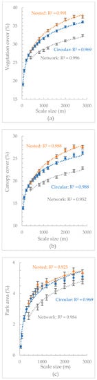 The average amount of (a) vegetation cover, (b) canopy cover, and (c) park area at different circular buffers (blue color), nested buffers (orange color), and network buffers (grey color).