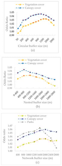 The results of the associations between each UGS metric at each scale and mental health were provided in Supplementary Materials. The odds ratio of each UGS metric in different buffers can be seen in Figure 4. For both circular and nested buffers, except for park area, the other two UGS metrics were positively correlated with mental health. For network buffers, all the three UGS metrics had positive relationships with mental health and park area showed the highest association while vegetation cover showed the lowest association. The inverted-U curves in Figure 3 showed that the relationships between UGS quantity and mental health were only significant at certain scales. We interpreted these as the thresholds beyond and below which associations were significant. Vegetation cover at circular buffers from 600 m to 2000 m, nested buffers from 400–800 m to 1200–1600 m, and network buffers from 1200 m to 2400 m showed significant relationships. For canopy cover, circular buffers from 200 m to 2800 m, nested buffers from 0–400 m to 2000–2400 m, and network buffers from 400 m to 2800 m showed significant associations with mental health. Compared with vegetation cover, canopy cover had smaller minimum threshold scales and larger maximum threshold scales to manifest significant UGS-health relationships. Park area was only significantly related to mental health at network buffers between 1200 m and 1600 m. For all three types of buffers, the associations of canopy cover with mental health at all the scales were larger than that of vegetation cover.
