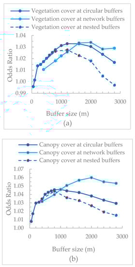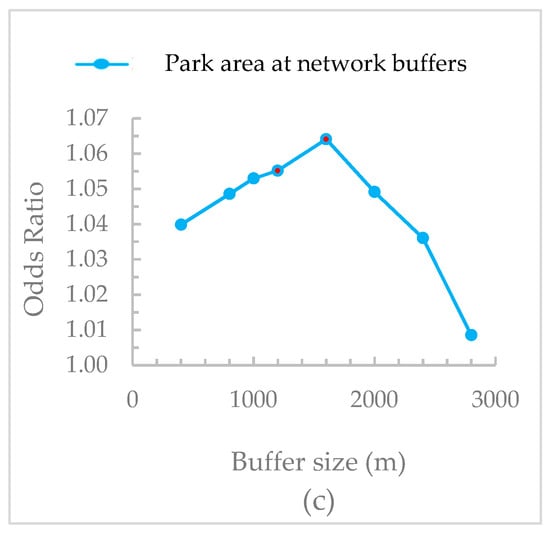 Figure 5 shows the impact of scale of analysis on odds ratio of each UGS metric. All the curves showed an initial increasing followed by decreasing trend. A similar pattern of the change trend of odds ratio at different types of buffers was observed for vegetation cover and canopy cover (Figure 5a,b). The associations with mental health at circular buffers were consistently higher than that at nested buffers (e.g., odds ratio at 800 m was higher than that at 400–800 m) and the difference between these two buffers increased with the increase of buffer size. Both vegetation cover at buffers smaller than 1600 m and canopy cover at buffers smaller than 1200 m showed higher associations at circular buffers compared to that at network buffers. Beyond these scales, the associations at network buffers were higher. Park area was unrelated to mental health across different circular buffers and nested buffers. At network buffers, park area showed a positive relationship with mental health but only at 1200 m and 1600 m (Figure 5c).
