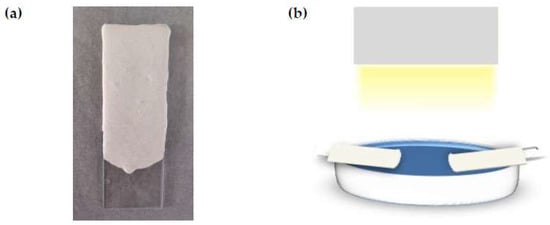 However, the photocatalytic concrete experiment was carried out as shown in Figure 1b. Place the PCS inclined into the 60 mL MB solution (10 mg/L) and keep the semi-exposure state. In addition, other experimental procedures are consistent with the powder experiment, except for no stirring. The MB adsorption ability of PCS photocatalytic activity was studied in dark for 1 h to reach adsorption saturation. Then, put them under irradiation with a 300 W of xenon lamp with visible light (λ > 400 nm) to assess the photocatalytic activity.