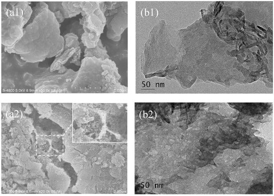 SEM (a); micrographs of pure CN (a1); and B2-CN (a2); TEM (b); micrographs of CN (b1); and B2-CN (b2).