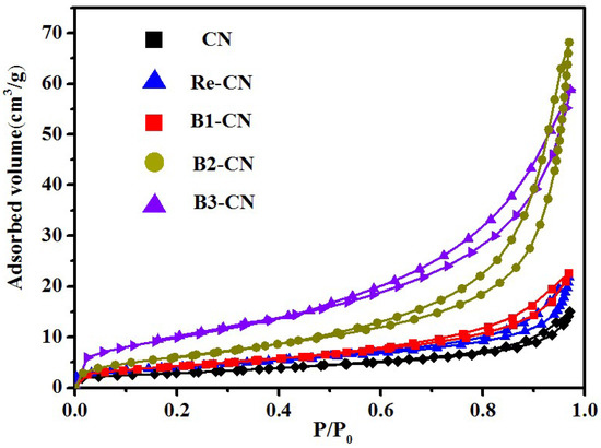 The specific surface area and porosity of CN are two crucial factors affecting the adsorption and photocatalytic reactions. As shown in Figure 4, the representative N2 adsorption-desorption isotherms of bulk CN and CN/B2O3 series are of type IV. According to the IUPAC type, the isothermal adsorption desorption curves exhibited the type “H3” hysteresis loop (0.7 < P/P0 < 0.97: CN, Re-CN, B1-CN; 0.5 < P/P0 < 0.97: B2-CN, B3-CN). The small hysteresis loops of CN and Re-CN located at high P/P0 are caused by the aggregation of 2D-lamellar structure. By contrast, the B-CN series materials exhibited an obvious hysteresis loop without limiting the adsorption at high P/P0, indicating the presence of more pores formed by B2O3 during calcination. Furthermore, details regarding the specific surface areas, average pore diameters, and pore volumes of different samples are summarized in Table 1. Comparisons of CN and Re-CN show that the repeated calcination increased the specific surface area, pore size, and pore volume values. Furthermore, all values increased obviously when B2O3 was mixed with CN and calcined. Among the B-CN series, B2-CN showed the highest specific surface area, average pore size, and pore volume, which is in good agreement with the characteristics of surface pores in SEM and TEM photographs.
