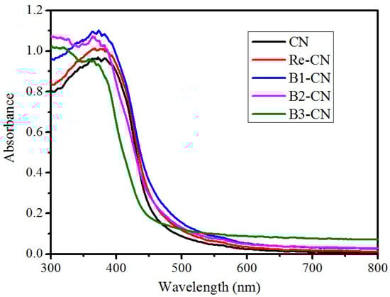 The DRS of the pure CN, Re-CN and B2O3/CN composite materials are shown in Figure 5. All samples exhibited good absorption properties at 300–450 nm. Re-CN, B1-CN, and B2-CN have better light absorption ability than CN and the maxima absorption wavelength were all observed at 365 nm. After B2O3 addition and calcination, an increase in the UV−vis light absorption over the entire wavelength range is observed. However, when the B2O3 content increased, the optical absorption feature of B2O3/CN decreased before 500 nm, and then increased. Furthermore, compared to pure CN, the B2O3/CN composite materials have a broader absorption range and better light absorption properties, which may be beneficial to the improvement of photocatalytic activities [30].