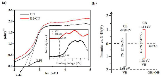 where C is a constant and A, Eg, h, and v represent the absorption coefficient, band-gap energy, Planck constant, and incident light frequency, respectively. Values of 1/2 and 2 for the constant n correspond to direct and indirect transitions, respectively. Based on the calculations and plots of (Ahv)1/2 versus hν presented in Figure 5a, the band gaps of CN and B2-CN are determined as 2.56 and 2.42 eV, respectively. This probably is attributed to the structure defects formed in the samples treated at melting state of the B2O3 during the heating process wrapped CN, which improve the optical absorption of materials. Furthermore, in order to analyze the band structure clearly, XPS measurements were carried out (Figure 6a insert graph). The VB potentials were 1.68 eV (CN) and 1.28eV (B2-CN). The conduction bands (CB) are calculated to be −0.88 (CN) and −1.14 (B2-CN). As is shown in Figure 6b, the VB potentials of B2-CN shifts positively leading to more oxidation of the holes and increasing photo-oxidation capacity, and the VB potentials of CN and B2-CN are all not more positive than E0 (OH/OH− = +1.99 eV vs. NHE) [31]. This demonstrates that ·OH could not be directly generated from the oxidation of OH− or H2O. Furthermore, the CB potential of B2-CN is more negative than E0(O2/O2·− = −0.046), indicating that O2 can trap electrons to form O2− and H2O2. These species are vital for photocatalytic degradation of MB [32].