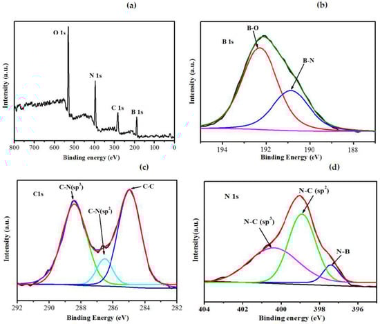 XPS survey spectra of (a) product and the deconvoluted spectra of (b) B1s, (c) C1s, (d) N1s.