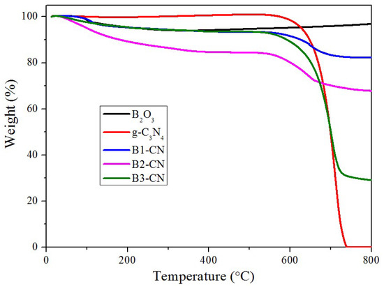 The thermo gravimetric curves of B2O3, CN, and CN/B2O3 series materials.