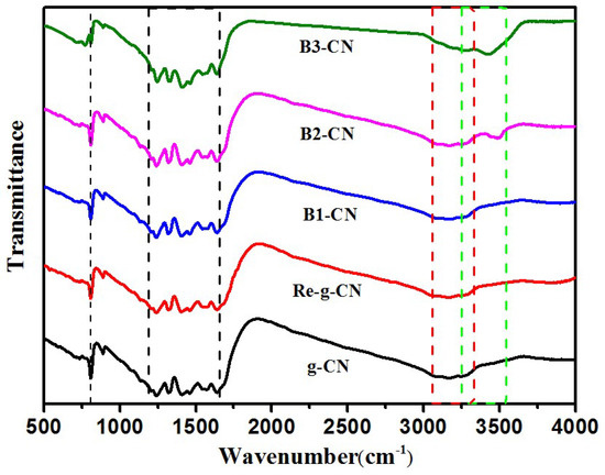 Figure 9 shows the Fourier-transform infrared (FT-IR) spectra of the CN and B2O3/CN series materials. In all samples, the multiple bands at 1200–1600 cm−1 are ascribed to the characteristic CN heterocycle stretching vibrations, and the sharp band at 810 cm−1 is assigned to the bending vibration of heptazine units [34]. This indicates that most of the structure of CN was retained after calcination and mixed with B2O3. The broad absorption band at around 3000–3300 cm-1 can be attributed to the stretching vibration of the NH bond, particularly the stretching vibrations of the primary and secondary amine groups [19,35]. The peak around 3200–3600 cm−1 in B2-CN and B3-CN can be assigned to OH [36].