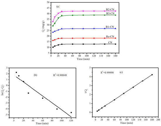 Adsorption kinetics curves for all samples (a); plots of the pseudo first order (b); plots of the pseudo second order (c).