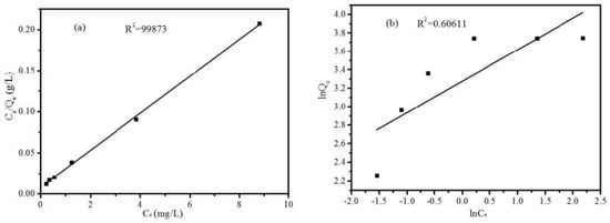 In the two equations, Qe and Qm represent the equilibrium adsorption capacity and the maximum adsorption capacity, respectively. Otherwise, Ce stands for the pollution concentration at adsorption equilibrium. KL, n and KF are all contents.