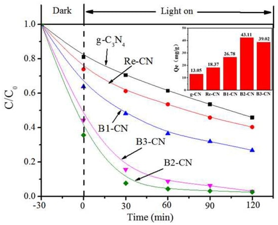 Figure 12 shows the dark adsorption and light-driven photocatalytic reduction of MB over the CN, Re-CN, and B2O3/CN series materials in an aqueous suspension. In the dark adsorption experiment, adsorption equilibrium was achieved after 30 min of magnetically stirring the mixture of the photocatalytic material and MB solution. After combining the two materials, the graph (Figure 12, inset) clearly shows that the adsorption ability of all B2O3/CN materials is much higher than those of CN and Re-CN. This adsorption ability of B2O3/CN toward MB may be closely related to B2O3. In 100 mL of the 20 mg/L MB solution, the adsorbed quantity of B2-CN was 43.11 mg/g, while that of CN was only 13.05 mg/g. After the dark experiment, the mixed MB solution was irradiated using a xenon lamp (λ > 400 nm) up to 2 h for the photocatalytic studies. After dark reaction and visible light irradiation, the highest removal efficiency obtained with B2-CN was in excess of 95% in 1 h. The degradation mechanism of MB was the same as that of general organic pollutants by photocatalysis. Degradation involves the generation of e- and h+, which again generate O2 and OH radicals, respectively. These radicals are highly reactive and act as degrading agents.