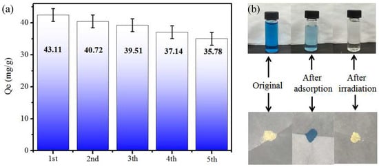 (a) cycling runs for the adsorption capacity of MB over B2-CN; (b) the MB solution and sample color in the original, after adsorption, and after irradiation stages.