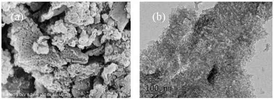 The SEM (a) and TEM (b) micrographs of B2-CN after the adsorption-photocatalytic process.