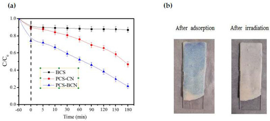 Photocatalytic of MB removal efficiency of BCS, PCS-CN and PCS-BCN under dark adsorption and light-driven photocatalytic (a) and color changes following irradiation of MB on the PCS-BCN surface (b).