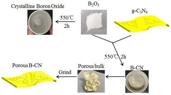 Composite of CN and boron oxide (B2O3): The CN and boron oxide were mixed into different weight proportions (3:1, 1:1, and 1:3) and then ground evenly. Then, the three different composite powders were placed one at a time into a ceramic crucible. Then, the samples were heated to 550 °C at a heating rate of 5 °C/min and maintained at 550 °C for 2 h. When the furnace was cooled to the room temperature, the powders were washed with water and ethanol several times. For convenience of description, the composite material samples are hereinafter abbreviated as B1-CN (CN/B2O3 = 3:1), B2-CN (CN/B2O3 = 1:1), and B3-CN (CN/B2O3 = 1:3). The preparation of B-CN is presented in Scheme 1.