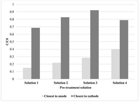 Figure 1 shows C/C0, where C corresponds to the concentration of copper at the end of experiment for a particular slice and C0 is the value of copper concentration at the beginning of the experiment for the same slice, both values are shown as a C/C0 ratio and, in this case, concentrations are presented for the slices closest to cathode and closest to the anode, for each pre-treatement solution after electrodialytic remediation.