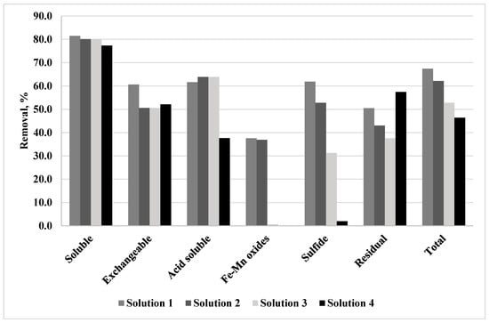 Specifically, in the case of the water-soluble fraction, the reduction in copper concentration was between 61% to 89% in the complete cell depending on the pre-treatment solution, as can be seen in Figure 3a. The biggest reductions were obtained for pre-treatment solution of H2SO4 + HNO3. This fraction has a high environmental impact, because it is the more mobile fraction and could easily be released.