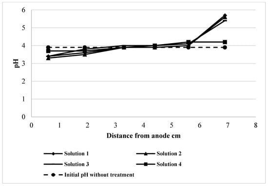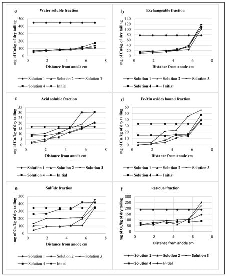 The copper concentrations associated with each fraction from anode to cathode are presented in Figure 3. The general trend indicates the highest removals in the case of the water soluble, exchangeable and Fe-Mn bound fractions and lowest removals of copper associated to sulfide and residual fractions in the slice closest to the anode. Certainly, the mobility of copper ions was linked to the pH trend through the cell, which is shown in Figure 4. A quick removal associated to low pH is observed near the anode, where the mobility and the dissolution of copper were enhanced, while on the other hand, the accumulation of metal or its reduced mobility with the pH increase due to the generation of hydroxyl ions, produced lower removal efficiencies.