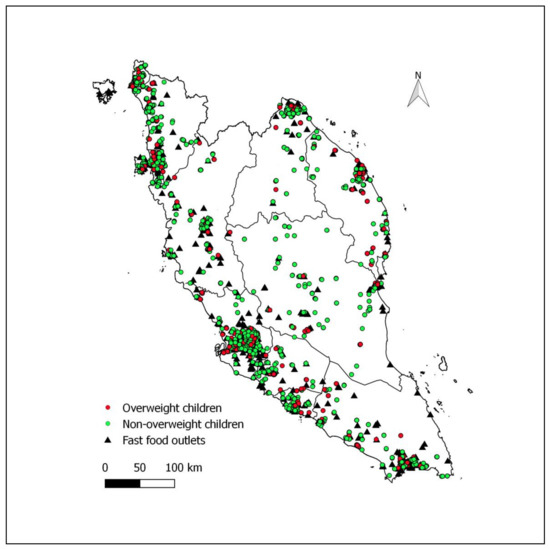 Distribution of fast-food outlets and houses of overweight (BMI-for-age z-score > +1 SD based on the WHO growth reference) and non-overweight children in Peninsular Malaysia.