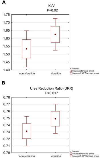 As shown in Figure 1, after a single hemodialysis session including five 3-min cycles of vibrations, an increase in in relation to non-vibration ( vs. ; ) (Figure 1A) was seen. URR% increased significantly ( vs. ; ) (Figure 1B).