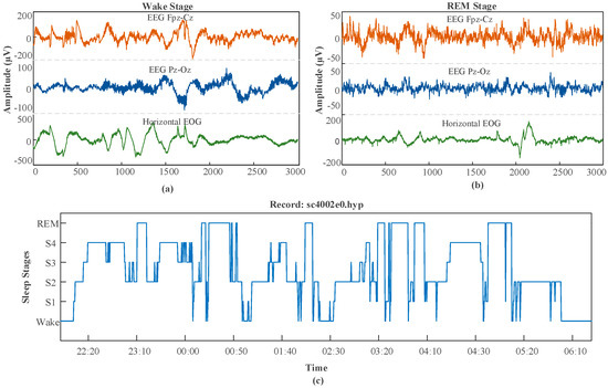 Sample polysomnogram (PSG) signals and scored hypnogram records obtained from the sleep-edf database: (a) wake stage, (b) rapid eye movement (REM) stage, and (c) hypnogram for sc40020 record between 22:20 and 06:10.