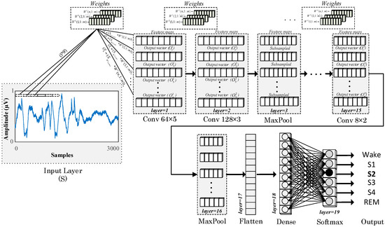 This convolution layer operation is similar to the feature extraction stage, and its output produces a feature map of the input. Either feature maps can be sub-sampled into a pooling layer that is placed inside the model, or they can be processed in consecutive convolution layers. The final layer of the CNN model usually contains a neural network layer, which is called a fully connected layer, and this layer performs the classification task. Figure 2 presents the block diagram of the proposed 19-layered 1D-CNN model for the automated recognition of sleep stages.
