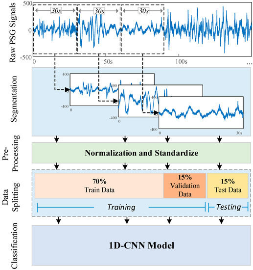 Raw PSG signals in the database were divided into 30-s segments. Thus, PSG segments with 3000 samples were used for each hypnogram value. In the experimental studies, the results were evaluated using different PSG signals taken from both sleep databases. We have analyzed the database using the following combinations of PSG signals: single-channel EOG, single-channel EEG, and single-channel EOG + single-channel EEG. Single-channel EOG channel signals contain one horizontal EOG signal in the recordings. The single EEG consists of the Fpz–Cz channel signal proposed in the literature [12,46,53] for each record. For the single-channel EOG + single-channel EEG, one horizontal EOG and Fpz–Cz EEG signal was used for each recording. When these signals were given as input to the CNN model, sample elimination was performed for the ambiguous scores (‘X’, ‘?’, so on). Additionally, no more filtering operations were performed, such as removing noisy signals from a certain range of amplitude. The preprocessing operations on signals contain the standardization and the normalization of signals to the zero to one range. The entire dataset was divided into three parts of 70%, 15%, and 15% for training, validation, and testing, respectively. Training and validation datasets were used to determine the layer parameters during the training phase of the model. The testing data was a new dataset that the model had not used or seen before. The test performance of the model was carried out on the trained model.