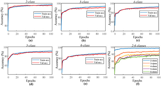 Performance graphs of the proposed 1D-CNN model with the single EOG signal for the sleep-edf dataset: (a) two-class model, (b) three-class model, (c) four-class model, (d) five-class model, (e) six-class model, and (f) validation accuracy for the models with two to six classes.