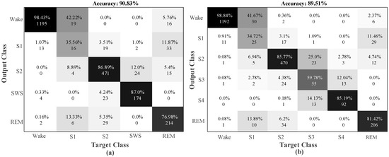 The testing data had never been used during training. As can be seen in Table 4, the training and testing accuracy values are close to each other. Hence, it implies that the proposed model has good generalization ability. It can be seen from Table 4 that the highest recognition performance for both the training and testing phase was obtained for two classes, which contained two sleep stage classes. The model has provided 98.06% accuracy on the test data for this class. The lowest recognition rates were obtained for the six-class and five-class datasets. Figure 5 shows the confusion matrixes obtained for six-class and five-class test data.