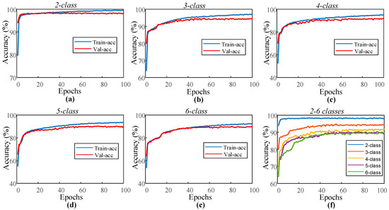 Performance graphs of the proposed 1D-CNN model with the single channel EOG signal for the sleep-edf dataset: (a) two-class model, (b) three-class model, (c) four-class model, (d) five-class model, (e) six-class model, and (f) validation accuracy for the models with two to six classes.