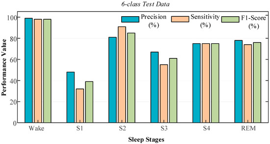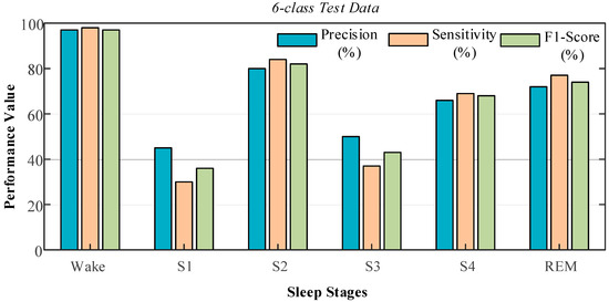 The trained model achieved 97.13% performance for the two-class dataset when fed with the unseen data. The lowest test performance of 87.08% was obtained for the six-class dataset, which contained the six different sleep stages. For this class, the values of the performance criteria were obtained using the test data, which is given in Figure 10, in detail.