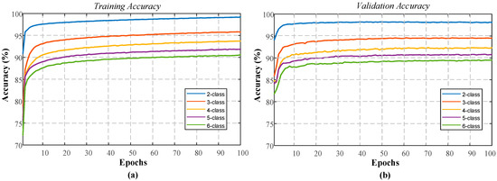The proposed model has obtained the highest training and validation accuracy values for the two-class experiments. The training and validation performances of the model for all the two-class, three-class, and four-class experiments were obtained over 90%. The detailed numerical values of the experiments are given in Table 9.