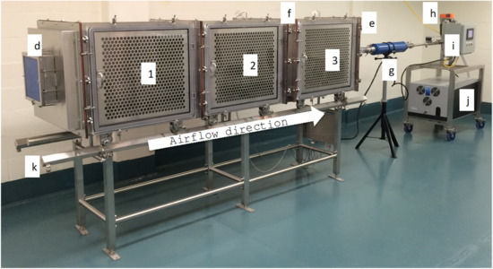 System overview. (1) Cage number one, (2) cage number two, (3) cage number three, (d) high-efficiency particulate air (HEPA) filter inlet air, (e) HEPA filter exhaust air (not visible in the picture), (f) particle separator, (g) muffler, (h) airflow adjustment valve, (i) control panel, (j) pump installed in an insulated box, (k) support table with rails.