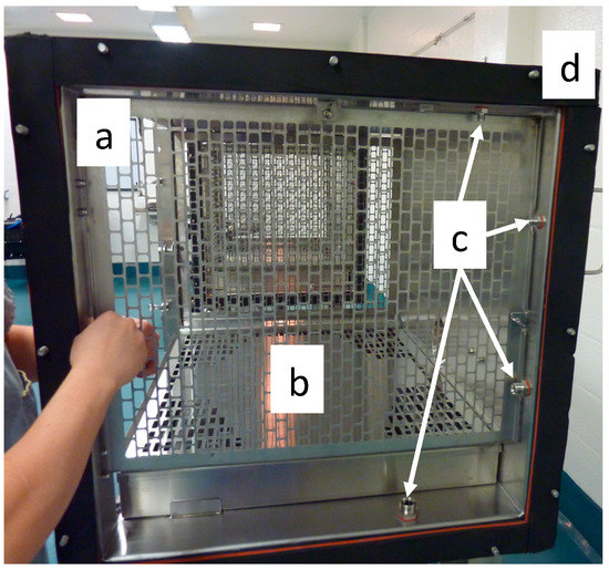 Side view of a cage. (a) Perforated grates on each side of the cage, (b) excreta pan with a perforated lid, (c) sampling ports, (d) rubber seal between cages.