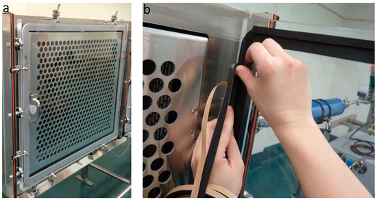 Cage door components. (a) Perforated stainless steel door and transparent polycarbonate door. (b) Rubber seal of the polycarbonate door.