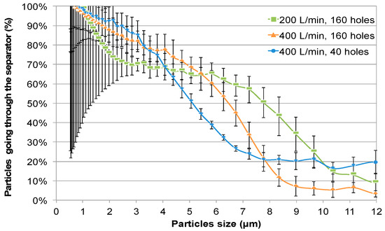 For every particle size from the APS, a mean count was calculated from 25 to 40 min of readings. The mean count obtained with the particle separator was divided by the mean count obtained at the same flow rate without the separator, thus giving a ratio of particles passing through the separator for each particle size. These ratios were plotted on graphs as illustrated in Figure 6 to estimate the D50 diameter. The experiment was repeated four times and the mean D50 diameter for each condition used was extrapolated.