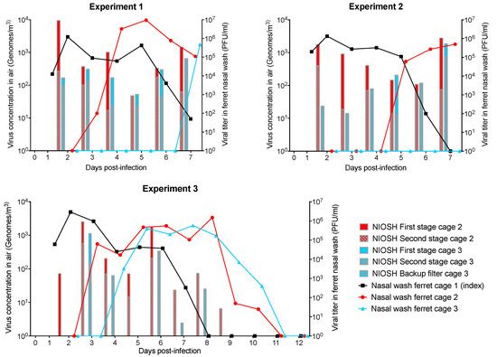 Air samples were collected every day using NIOSH two-stage bioaerosol cyclone samplers and SKC BioSamplers. Air samplers were connected to sampling ports located in cage two (between the perforated grates of cages one and two) as well as in cage three (between the particle separator and the perforated grate). Air sampling with NIOSH two-stage bioaerosol cyclone samplers was performed at 2 L/min for 24 h. At this flow rate, the cut-off separations of the NIOSH two-stage bioaerosol cyclone sampler were: 4 µm for first stage, 1.7 µm for second stage, and the remaining particles were collected on the backup filter. Air sampling started when ferrets were placed in cages after the infection of the ferret from cage one, and was stopped before shutting down the ventilation system for the daily nasal wash. Samples were eluted from NIOSH two-stage bioaerosol cyclone samplers by vortexing for 1 min in MEM (minimal essential medium; 5 mL in first stage, 500 µL in second stage, 5 ml in backup filter). Air sampling with SKC BioSamplers was performed at 11–14 L/min (determined by critical opening of the instrument) for 20 min and was set before shutting down the ventilation system for daily animal care. SKC BioSamplers were filled with 20 mL of MEM (minimal essential medium) without bovine serum albumin (BSA). After air sampling, 150 µL of BSA was added to the remaining liquid of the SKC BioSampler. Air samples were kept frozen at −80 °C until further quantitation. The virus concentration in NIOSH two-stage bioaerosol cyclone air samples was measured using qPCR [16]. The virus concentration in BioSampler air samples was measured using plaque assays on ST6GalI-MDCK cells and embryonated chicken eggs [17].