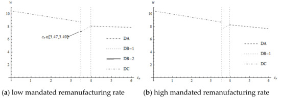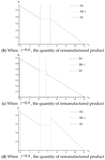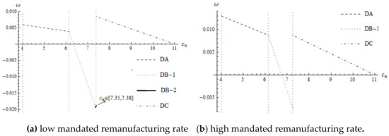 Under a high mandated remanufacturing target, once the manufacturer’s optimal decisions switch from DB-2 to DC, the quantity of new products reduces quickly but the change in the quantity of the remanufactured product is affected by the remanufacturing target. As shown in Figure 4.