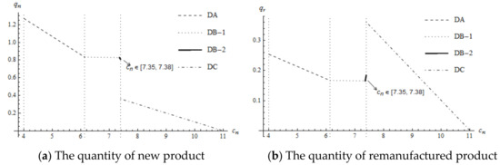 Based on Proposition 4, when the supplier’s optimal decision changes from DB-2 to DC, the wholesale price increases quickly, leading to decreased demands for new components. Thus, the quantity of new products decreases rapidly whereas the quantity of remanufactured products increases rapidly. As shown in Figure 3, is a piecewise point.