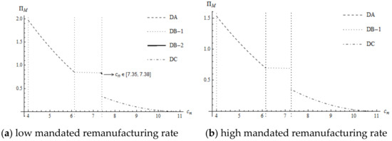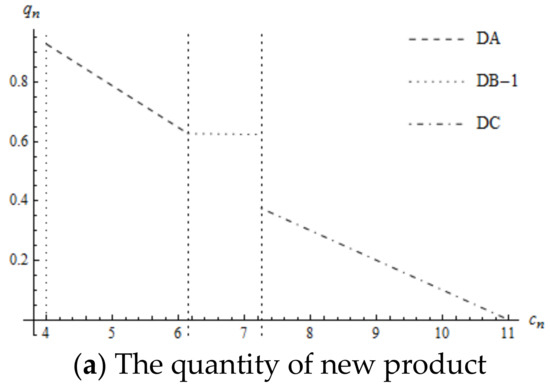 When the cost of a new component is moderate, namely decision DB-2, the manufacturer voluntarily collects part of the used products for remanufacturing. The competitiveness between new products and remanufactured products is dominant. In order to prevent the manufacturer’s remanufacturing, the product design that the supplier implements is harmful to remanufacturing; that is . However, as the cost of new component increases, the profit of new products decreases, weakening the deterrent effects of the supplier’s product design on the manufacturer’s remanufacturing. Thus, in order to reduce one’s own profit loss from the cost of product design that is harmful to remanufacturing, the supplier enhances the negative level of interchangeability in the new component. The higher the cost of remanufacturing, the less profit there is in the remanufactured products. Then, the supplier decreases the negative level of interchangeability, thereby preventing the manufacturer from remanufacturing.