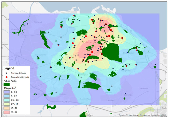 Public parks (1949) and the road traffic accident density (1937/1946) in Edinburgh, UK, in relation to primary and secondary schools.