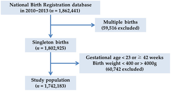 This nationwide registry-based study analyzed data from 1,862,441 live births in 2010–2013 registered in the Korean national birth registry. The birth weight of term infants and the proportions of preterm births and low birth weight were analyzed according to the concentration of PM10 during pregnancy. In Korea, all parents must report their child’s birth within 1 month and include the following information: month and date of birth; maternal residential address at the time of birth; place of birth (hospital or elsewhere); parental ages; gestational age (weeks and days); sex; birth weight; birth order; total number of births; and parental education, occupation, and nationality. All data were acquired from Statistics Korea [24], which offers data (except for date of birth and days of gestational age, which are withheld for reasons of privacy protection) to all researchers who submit the objective of a study to their website. Because the individual identifier number was removed from the individual record to protect the privacy of the individuals, each birth record was treated as a separate family member, even though a couple may have had more than one child during the study period. Since multiple births are a major factor associated with preterm birth and low birth weight, 59,516 records (3.2%) involving multiple births were excluded. In addition, we excluded 1299 records with a gestational age < 23 weeks or a birth weight of <400 g according to the guideline for withholding of neonatal resuscitation [25]. Moreover, to compare premature births with normal births, we excluded 59,443 observations with a gestational age of ≥42 weeks or a birth weight > 4000 g (Figure 1). Thus, this study evaluated data from 1,742,183 records.