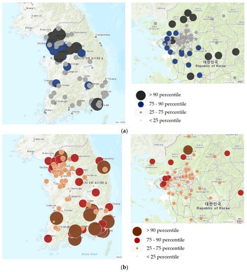 (a) Distribution of particulate matter less than 10 μm in Korea. (b) Distribution of preterm births in Korea.