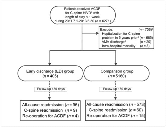 Flowchart of data processing for outcomes of a cohort of anterior cervical discectomy and fusion (ACDF), the early discharge (ED) group versus the comparison group, in Taiwan, 2011–2013 (n = 6,271). 1 HIVD, herniation of inter-vertebral disc. 2 The total number for all of the criteria exceeded 706 because 7 patients met multiple criteria. 3 Patients were tracked back for 5 years, thus, only cervical spine problems in the 5 years prior to the index surgery were excluded. 4 AMA discharge, discharge against medical advice (mostly for non-medical reasons).