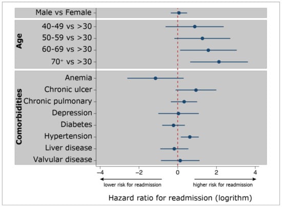 Adjusted hazard ratios for re-admission for the early discharge (ED) group after the ACDF surgery by potential risk factors (2011–2013, n = 405). A positive value of the logarithm of adjusted hazard ratio implies significant risks for re-admission.