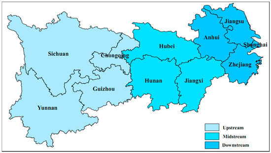 Traditionally, the YREB is divided into three regions: upstream, midstream, and downstream, as properly colour-coded in Figure 1. The upstream region consists of three provinces, Sichuan, Guizhou, and Yunnan, and a provincial-level municipality, Chongqing. The midstream region includes three provinces, Hubei, Hunan, and Jiangxi. The downstream region refers to three provinces, Jiangsu, Zhejiang, Anhui, and a provincial-level municipality, Shanghai. Without causing confusion, we shall hereafter refer to these 11 YREB jurisdictions as provinces.
